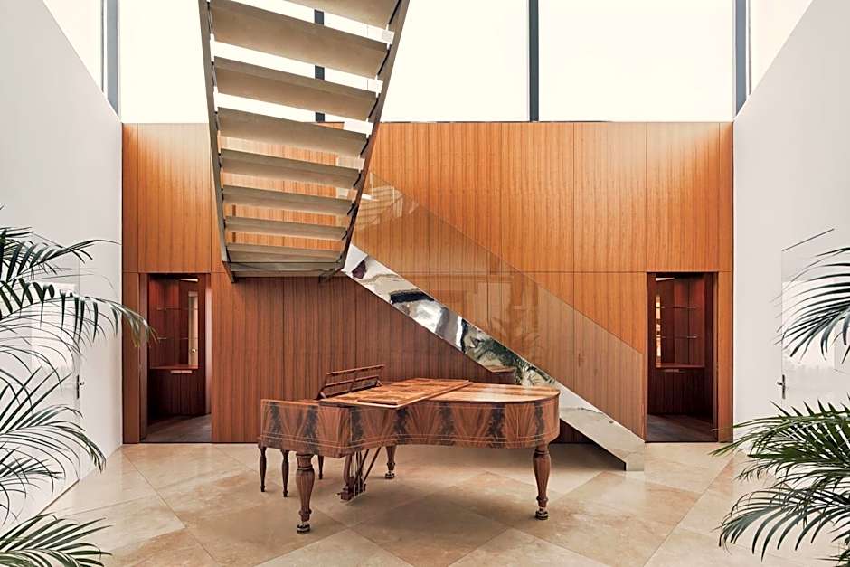 The Maestro Suite is a homage to Herbert von Karajan. It is located in the tower of the main building. The 2 floors of the Maestro Suite offer 2 bedrooms, a living and dining room with a fireplace, a kitchen, 2 bathrooms, a library and a furnished terrace. An on-call butler services is provided. Amenities include a B&O satellite TV with radio and on-demand service, a B&O stereo system, a Nespresso coffee machine, a spa bath and a sauna, Kerstin Florian skincare products, free WiFi and newspapers.